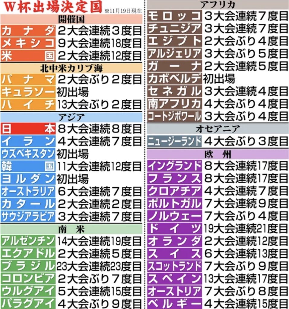 W杯2026からは48カ国が出場し、4チーム×12グループに分かれる形式となった。さらに、各組の上位2チーム+3位の上位8チームが決勝トーナメントに進出できるため、従来よりも「突破可能性が高い」大会形式になっている。